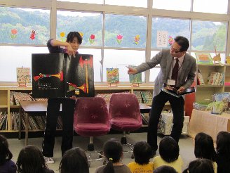 ぶっくんのお姉さんと、お話キャラバンさんが読み聞かせをしに
