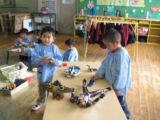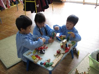 下・・・年中組は、折り紙をしたりブロックなどで遊びました。新しい保育室になり遊具も少し変わり、新鮮な気持ちがするようです。