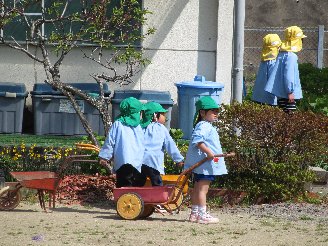 緑の帽子のもも組は、ポーターを引いているだけで楽しそうでした。お友達と同じことをすることの喜びを感じていたひと時でした。