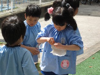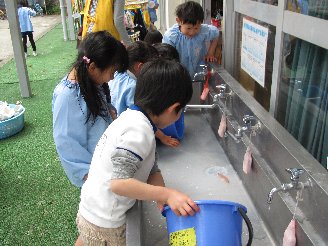 左・・・牛乳パックを洗い終えバケツの水を流している年長組です。(エコへの関心がでてくるかな?)