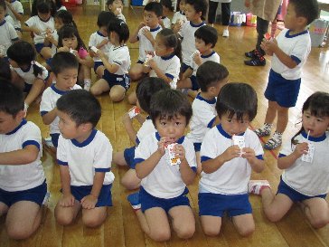 年長さんに年中さんが牛乳パックの開き方を教えて
