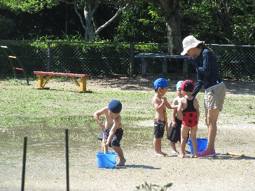 梅雨の晴れ間に、園庭では、水鉄砲遊びや水遊びを楽しみ