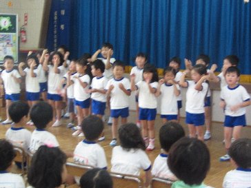 全体の集まりで、夏祭りに踊る「モーモちゃん体操」を踊りました。