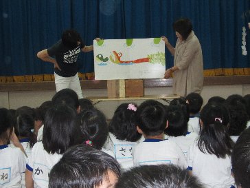 お話キャラバンさんが、大型紙芝居「999ひきのきょうだい」と