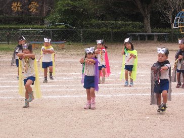 もも・すみれ組の遊戯は「かいじん百面相」です。かっこいい