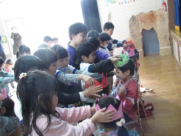 子ども達は、新聞紙を丸めた豆で鬼退治!「おにはーそと!ふくはーうち!」。