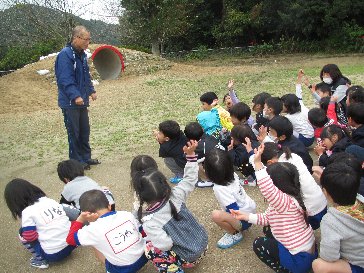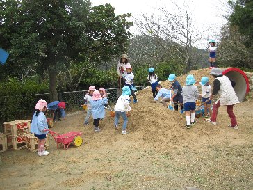 ゆり組さんとさくら組さんが、トンネル山に、土を入れる
