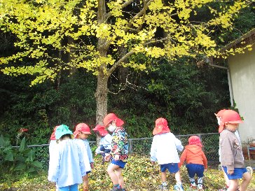 園庭のイチョウの木が色づきました。落ち葉を拾ったよ!